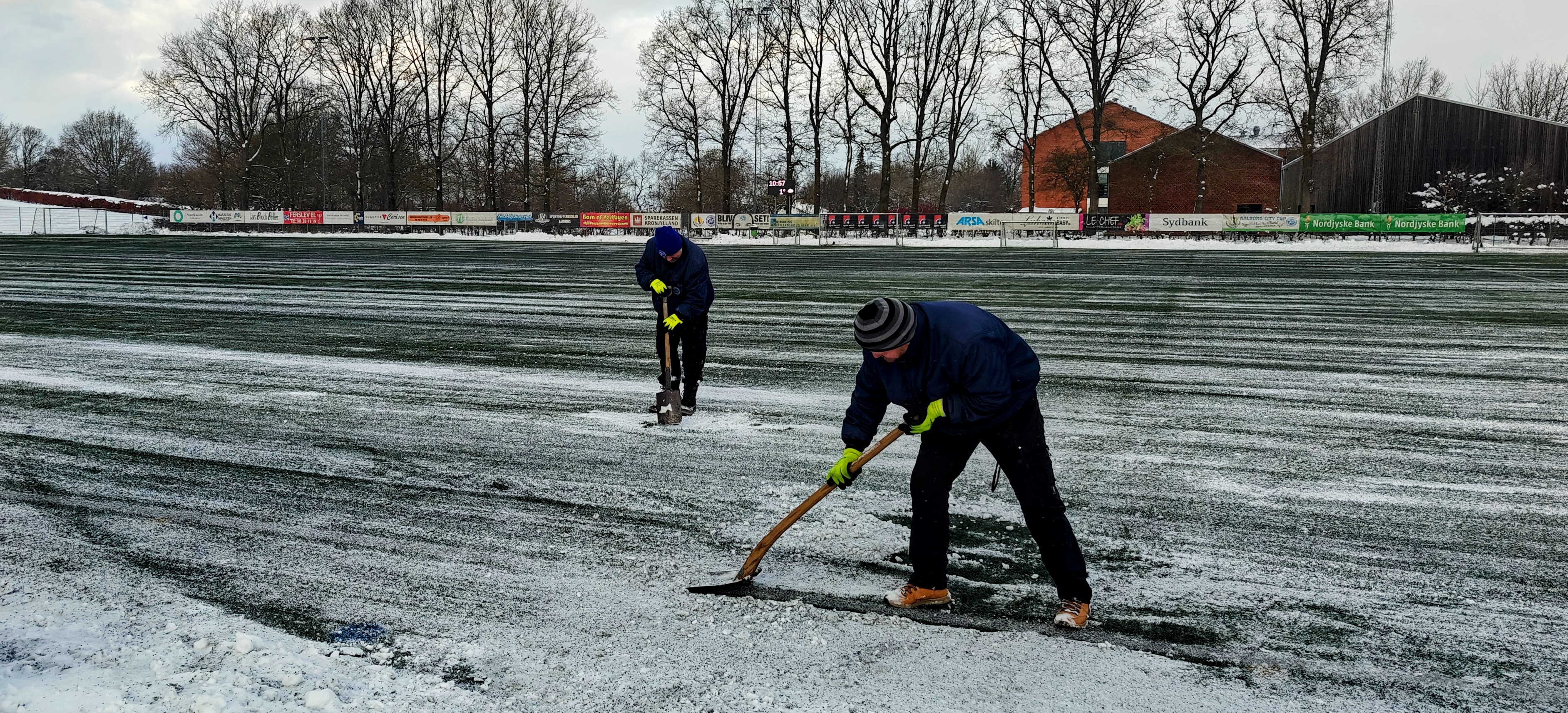 Efter en grundig indsats er kunstgræsbanen nu ryddet i en grad, så den igen kan åbnes for aktivitet. Steffen og Ole har arbejdet med de sidste hårdføre klumper sne, og banen vurderes nu som spilbar.